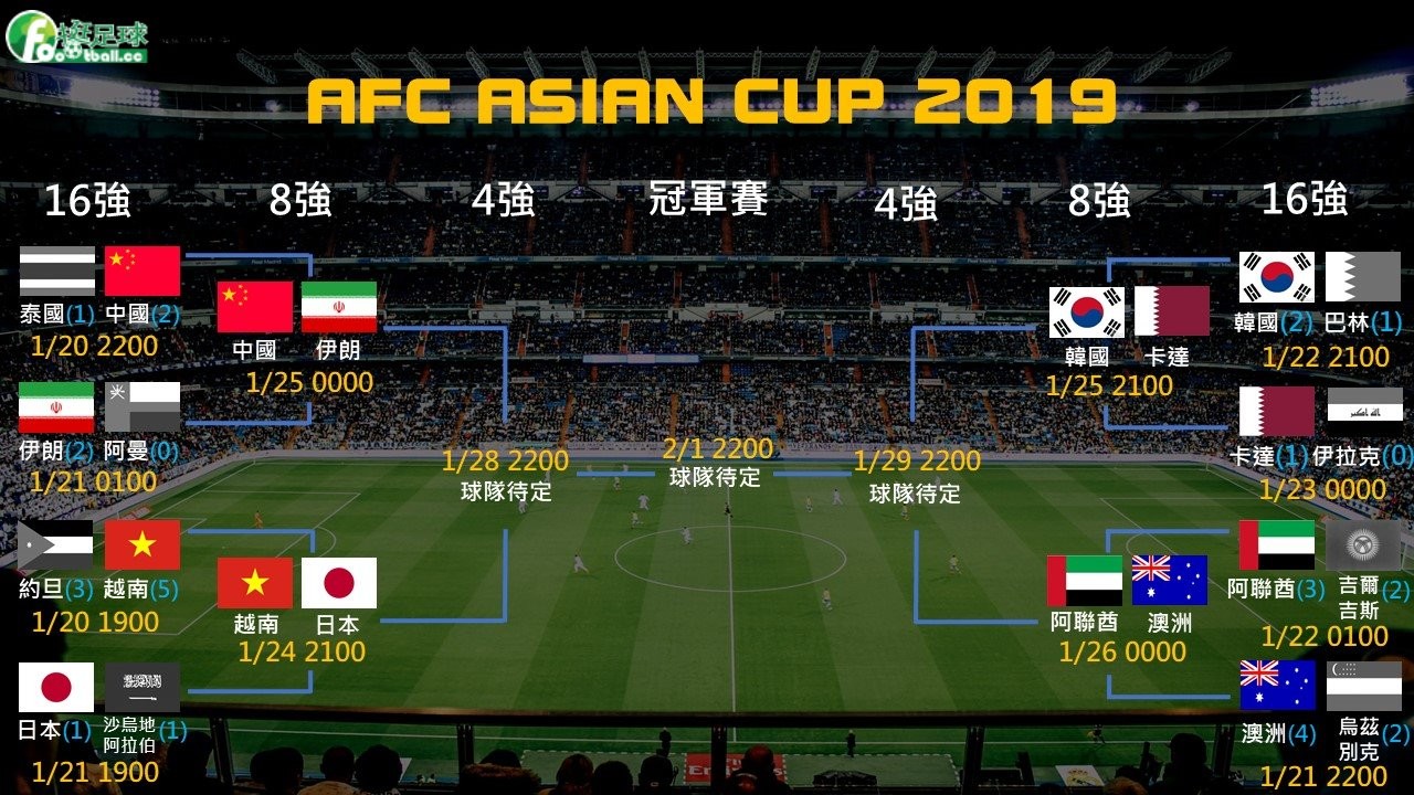亞洲盃昨晚韓國和卡達獲勝後,結束了16強的比賽,8強球隊正式到齊,包括中國、伊朗、日本、越南、韓國、卡達、阿聯酋和澳洲。