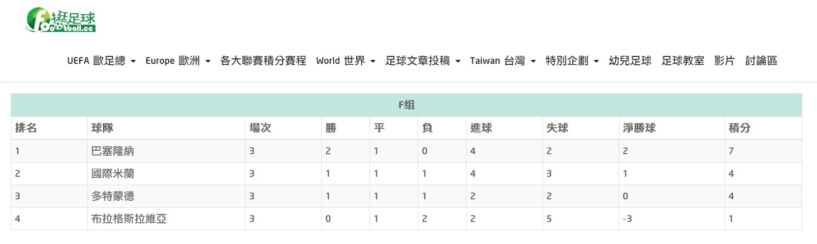 歐冠死亡小組F組的賽事,巴薩客場面對布拉格斯拉維亞,場面略顯劣勢,但巴薩依然靠著梅西進球,2-1取勝。另一場強強對話,國米在主場2-0完勝多特蒙德,排名升至小組第二。